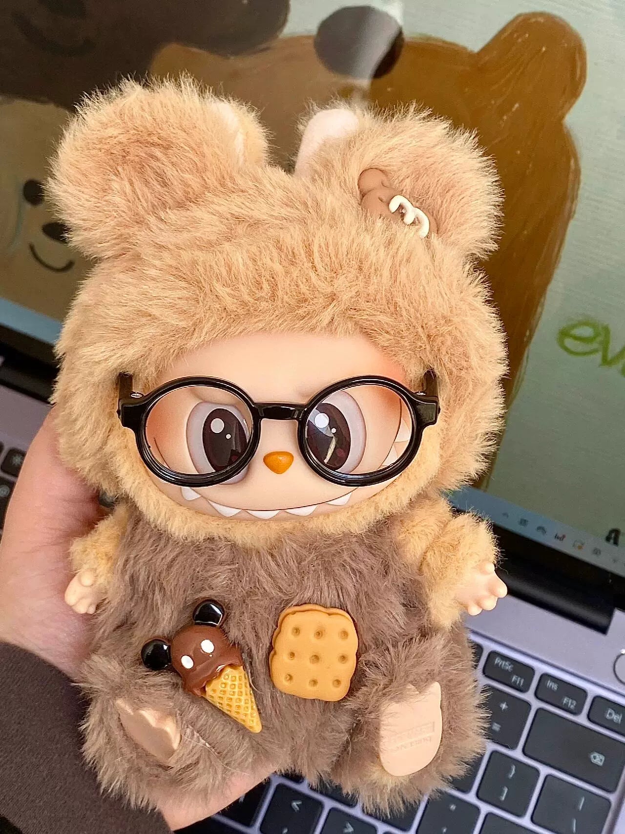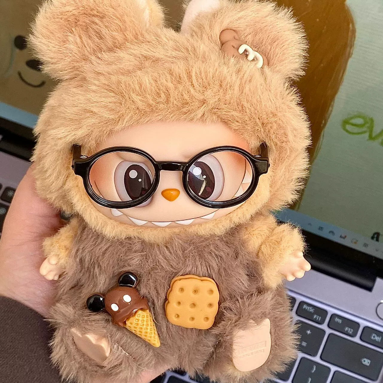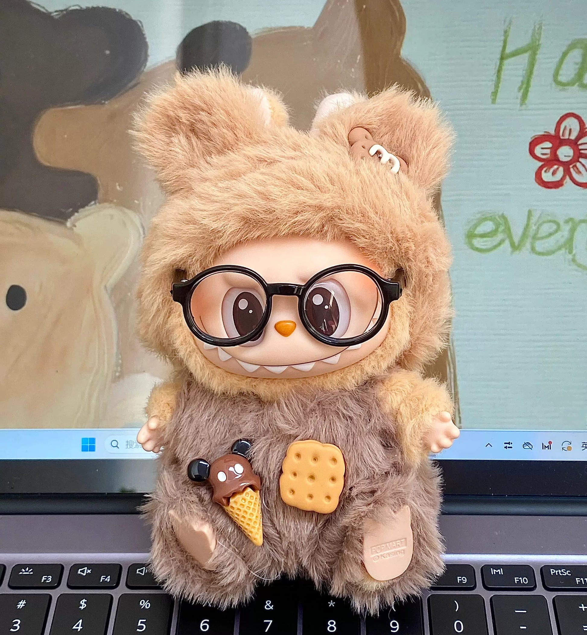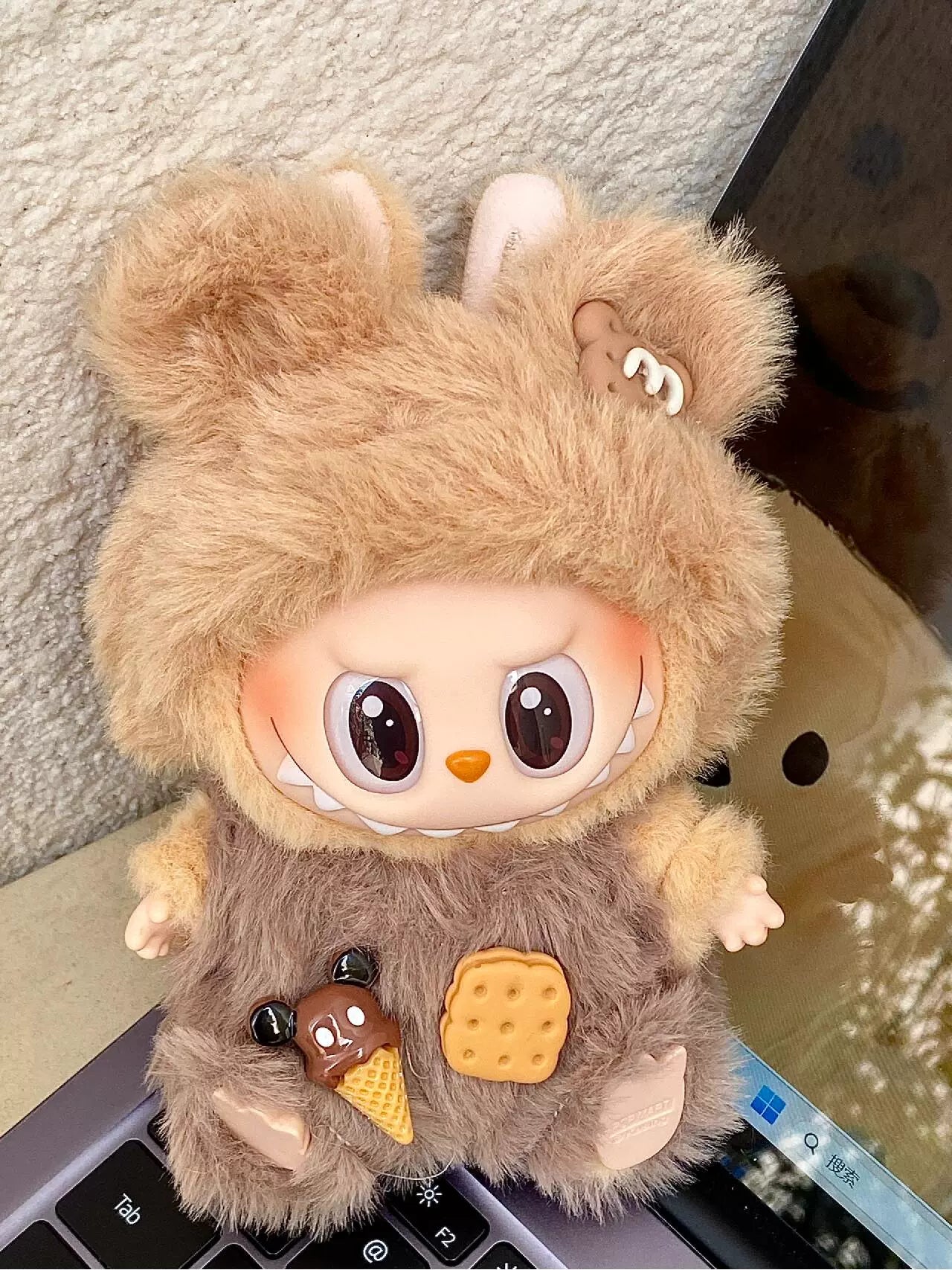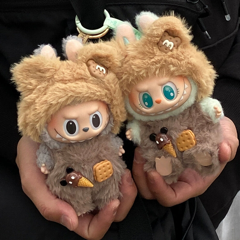 POP MART Labubu Doll Clothes Set - Teddy Bear Overalls + Hat w/Fuzzy Trim for Cotton & Vinyl Figures 17cm (No Doll Included) | Biscuit-Themed