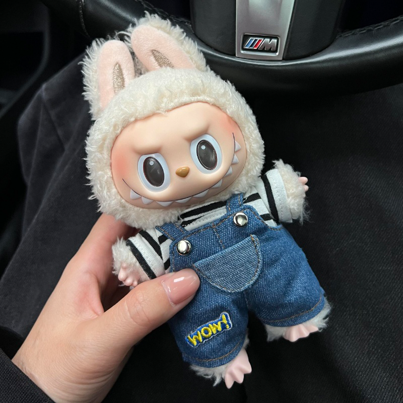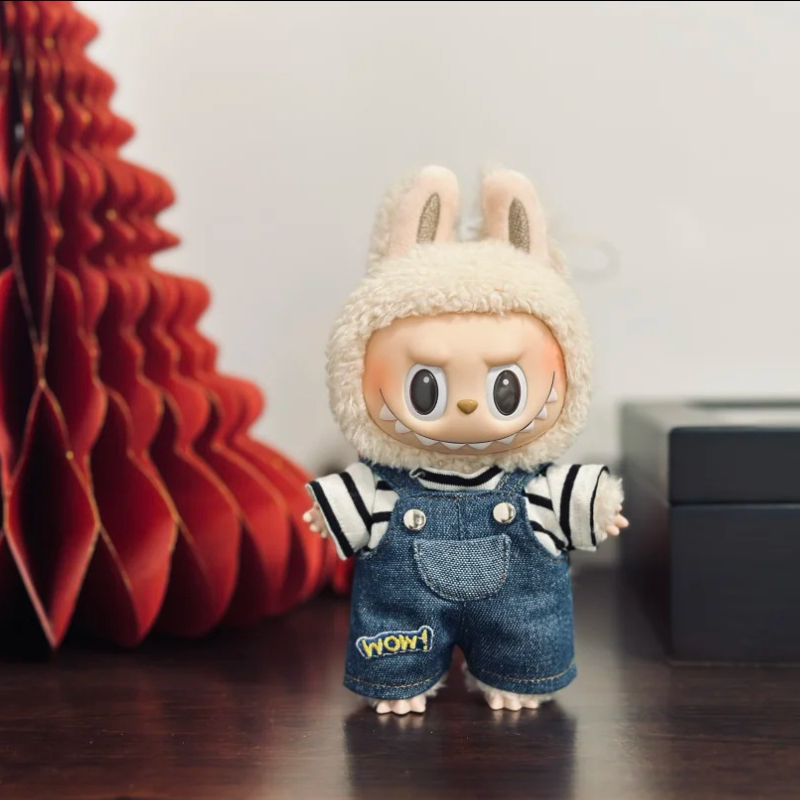 17cm Labubu Handmade Striped T-Shirt & Pocketed Denim Overalls | Clothes Only