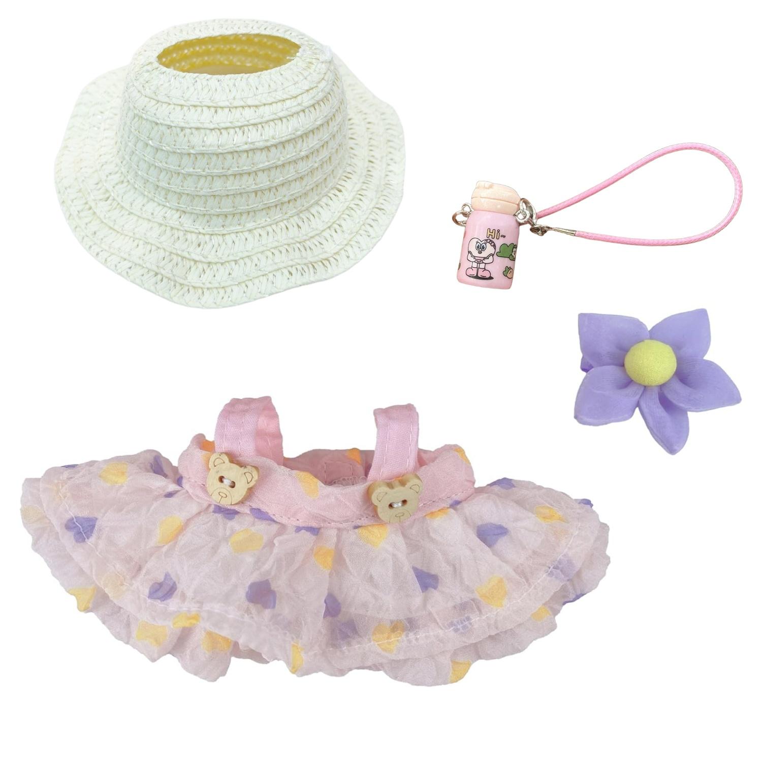 - Complete Set: Includes a pink knit bucket hat with bunny patch, floral print ruffled dress with bear button details, and a purple flower accessory for 17cm dolls.