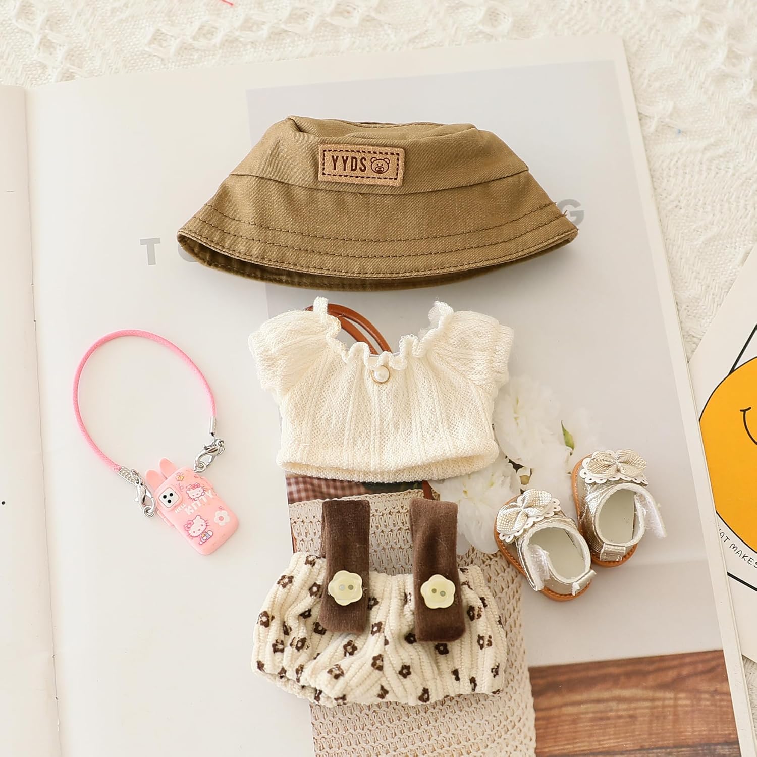 Clothes Set for LABUBU Doll,Clothes for Labubu, Crochet 4 Piece Set Hat Clothes Cell phone Backpack for LABUBU, Stylish Adorable Dolls Clothes Accessories (No Doll)