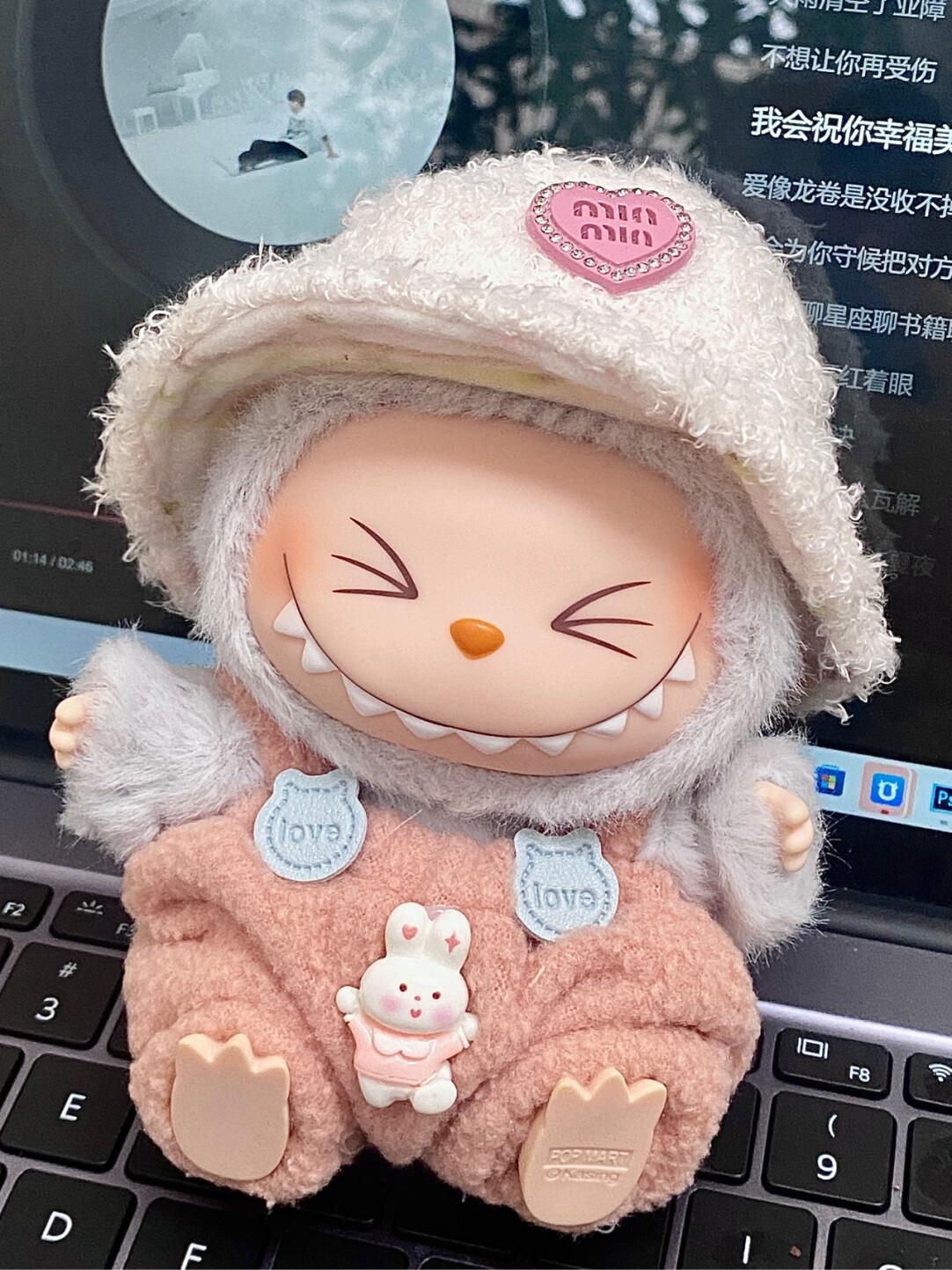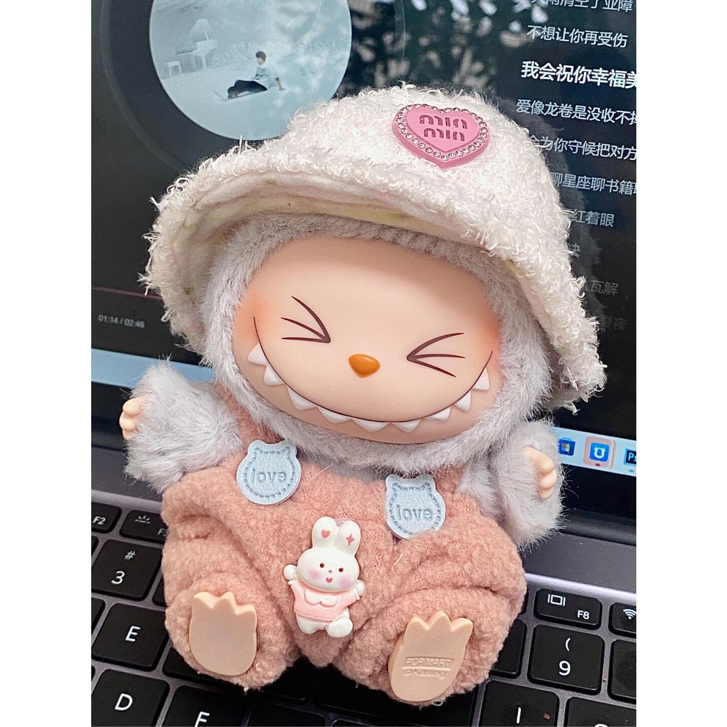 LABUBU Clothes 3-Piece Set (Pants, Hat, Thermos) - POP MART Doll Clothes Accessories - Cute Pink Rabbit Outfit for 17cm/6.7" LABUBU Plush Doll