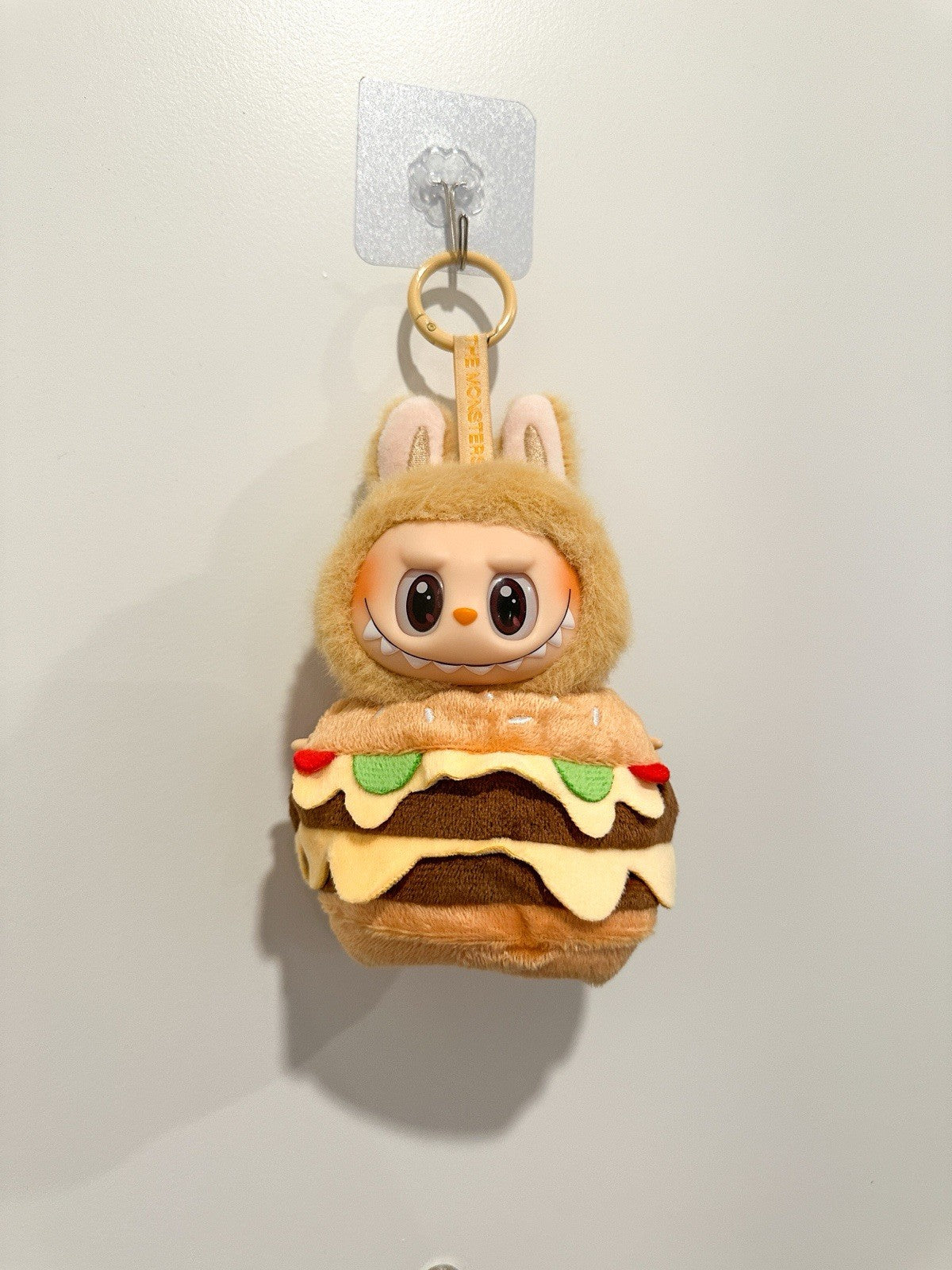 Labubu hamburger costume! There are armholes and feet holes but your labubu will most likely be fully covered unless it is the V1 or V3 series. This fits all labubu sizes otherwise. DOLL NOT INCLUDED.