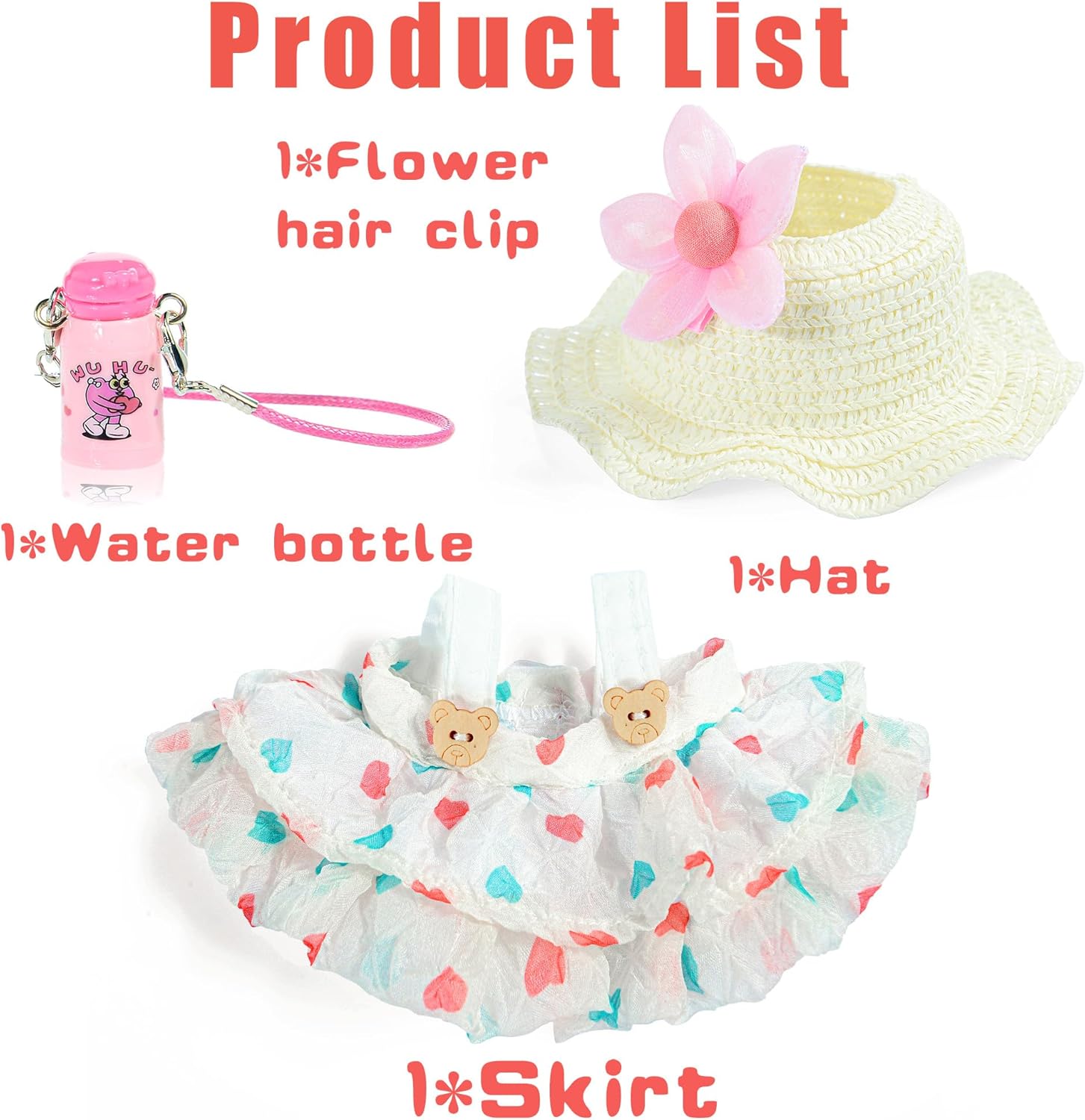 One Set Kawaii Doll Clothes for 17cm Plush Dolls - Green Floral Collection Dress + Hat + Bag + Hair Clip Fits 6.7 Inch Mini Dolls (No Doll No Glasses)